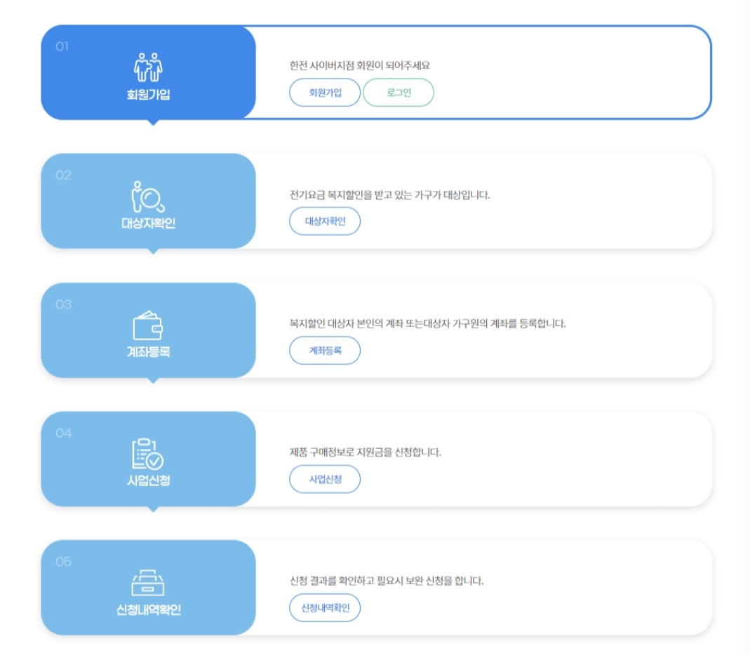 한국전력 웹사이트 접속하여 준비한 서류와 개인정보를 입력하고 신청하면 완료됩니다.