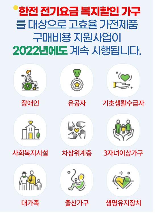 한전 저기요금 복지할인 가구를 대상으로 에너지 복지 확대를 위해 교효율 가전제품을 구입할 경우 구매 비용의 10% 가구당 30만 원 한도에서 지원해 주는 사업을 말합니다.